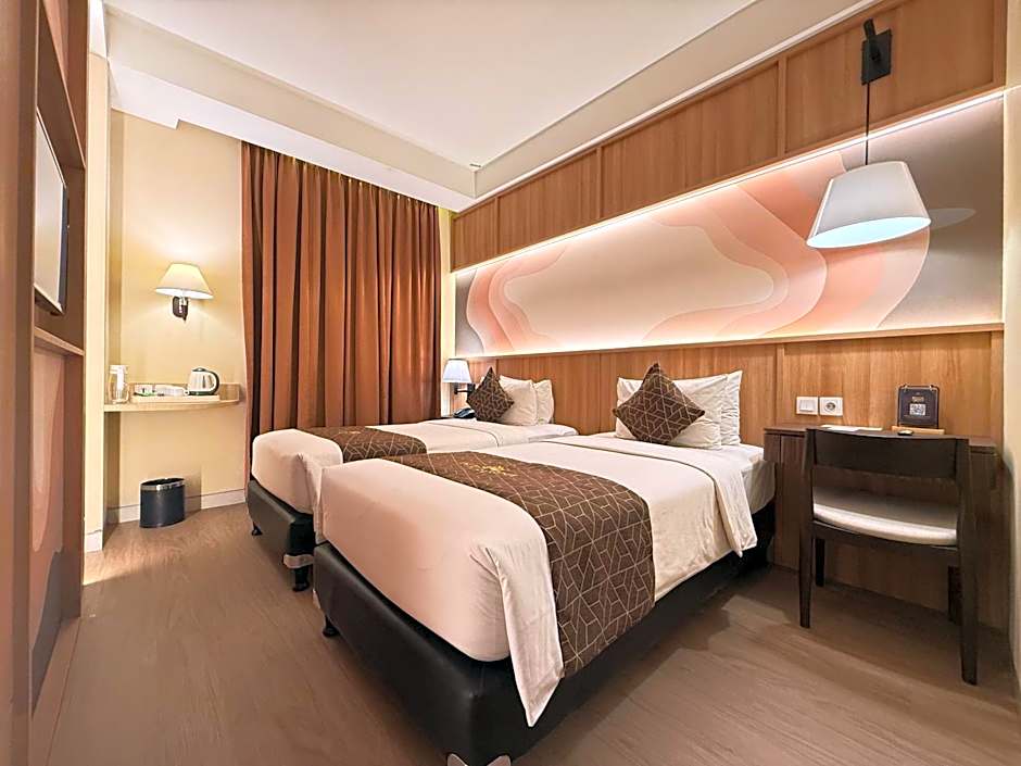 This modernly designed twin/double room features touches of traditional Batik patterns and has a balcony overlooking the pool, city and mountain views. The private bathroom comes with shower facility, slippers and free toiletries.